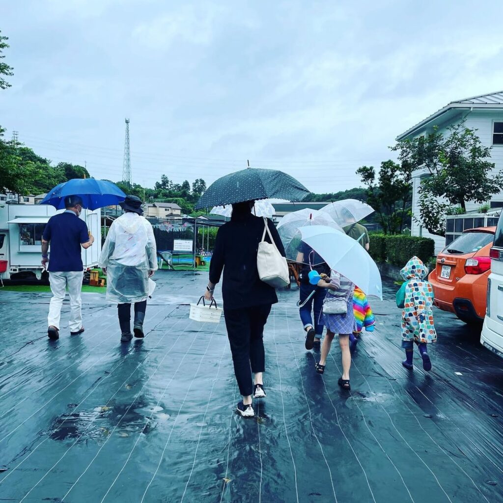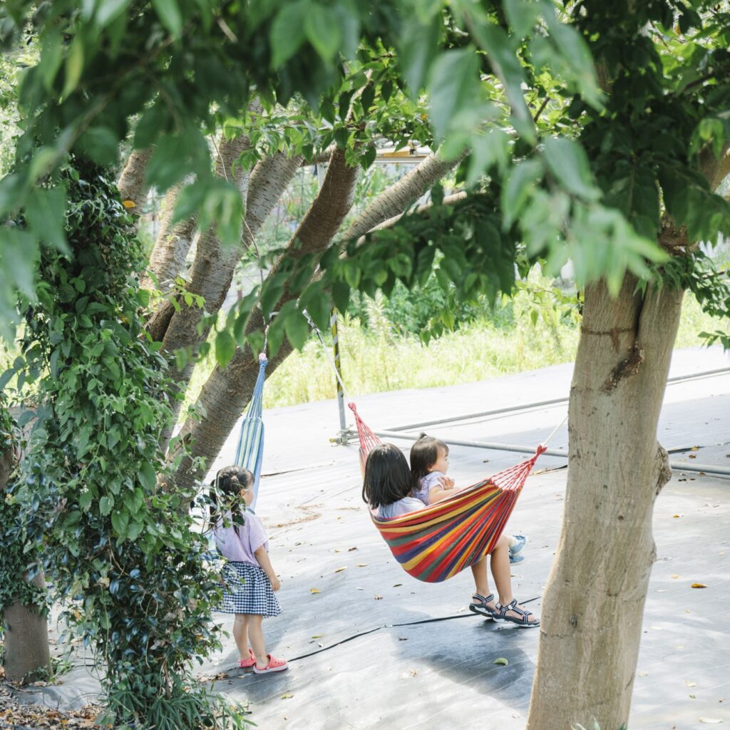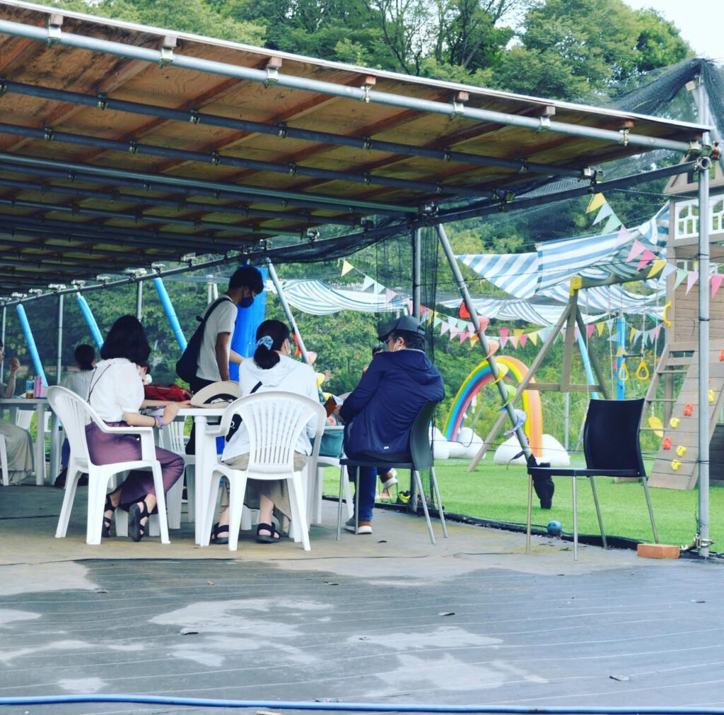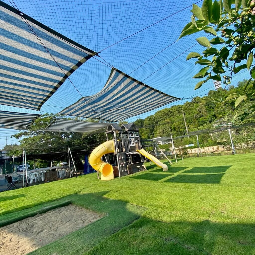 圃場入り口にテーブルとイスを用意した屋根付き休憩所があります。圃場内にはパラソル付のテーブルとイスを設置し、キッズエリア各所に日除けをしています。木陰にハンモックもあり、定期的に散水もしていますが各自帽子や日傘で暑さに気を付けて楽しんでいただけたらと思います