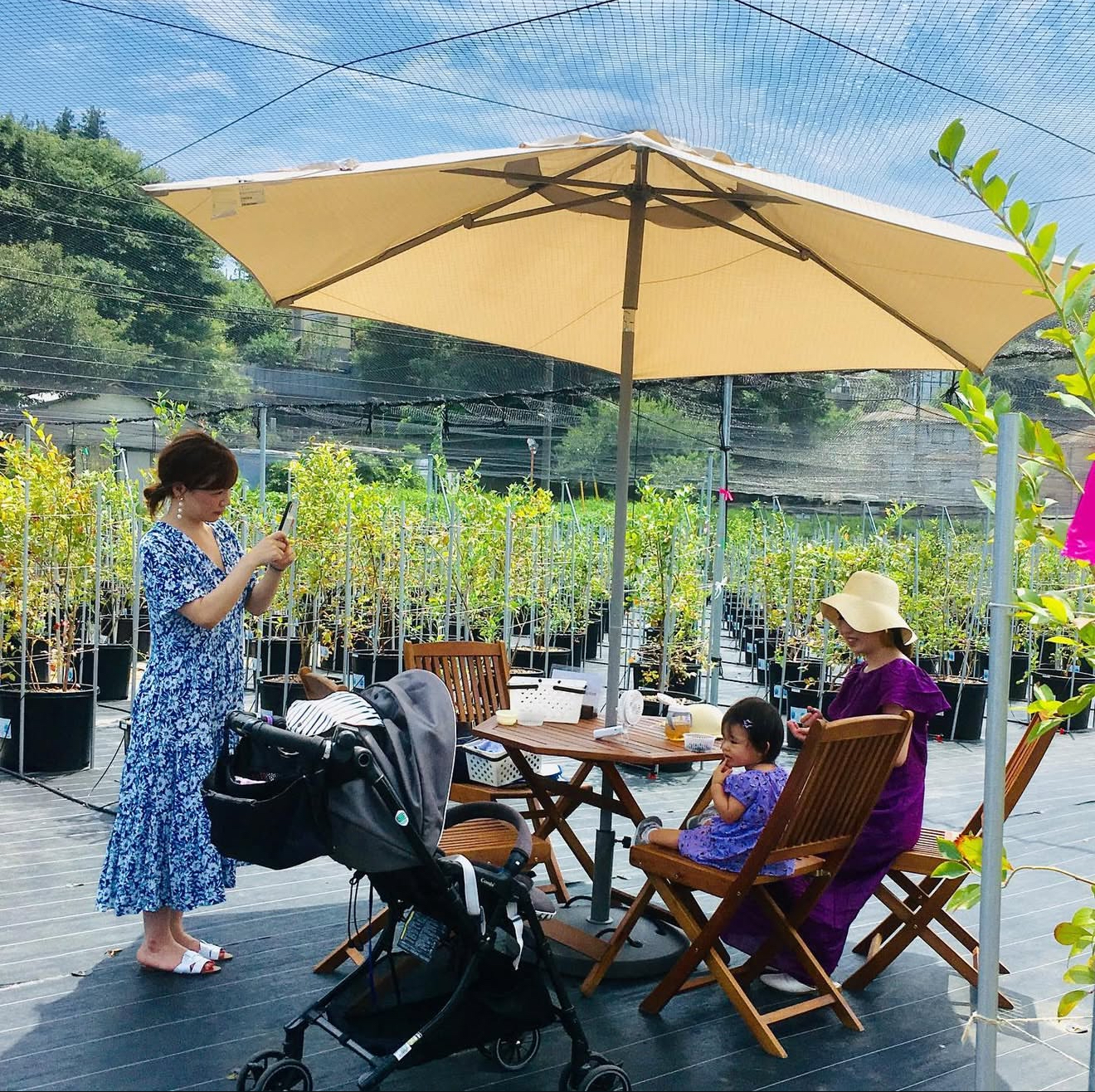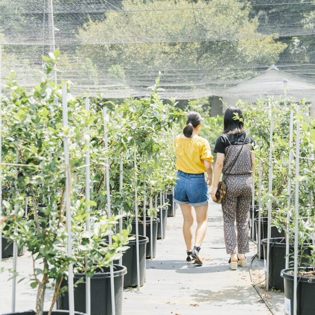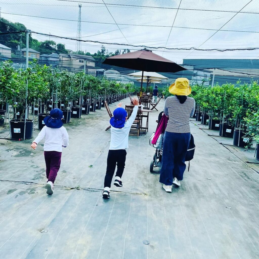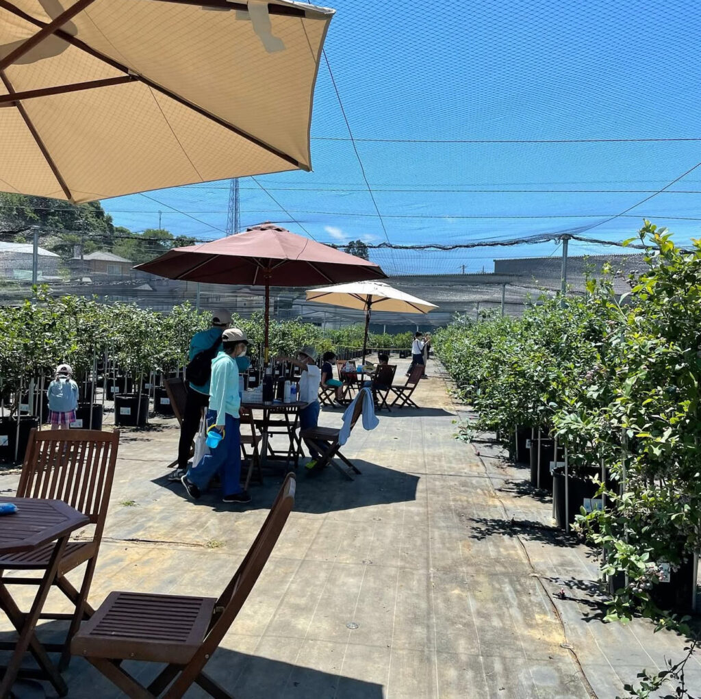 地面には防草シートを全面に敷いてありますので、小さいお子様から先輩方まで歩きやすい環境となっております。夏季のブルーベリー狩りではサンダルで歩くことができます。楽ちんな格好またはオシャレをしてぜひ遊びに来てくださいまた、ベビーカーとの入場も可能です。小さなお子様も収穫できる高さに剪定もしてありますので低い位置にもブルーベリーの実がついています。た、ベビーカーとの入場も可能です。小さなお子様も収穫できる高さに剪定もしてありますので低い位置にもブルーベリーの実がついています。雨の日も、泥だらけにならずスニーカーや長靴で歩けます。傘をさして歩ける幅です。車椅子のお客様も、ご家族またはその方のお手伝いをする方のご協力のもとご入場できますので安全第一に皆様ご一緒にお楽しみいただけたら嬉しいです。圃場(ブルーベリー狩りエリア)入口に少し坂がございますが、皆様お足元にお気を付けて入場していただけたらと思います。雨風でブルーベリーが地面に落ちていますが、スタッフの掃き掃除が間に合わない時があります。よけて歩いていただけると助かります。