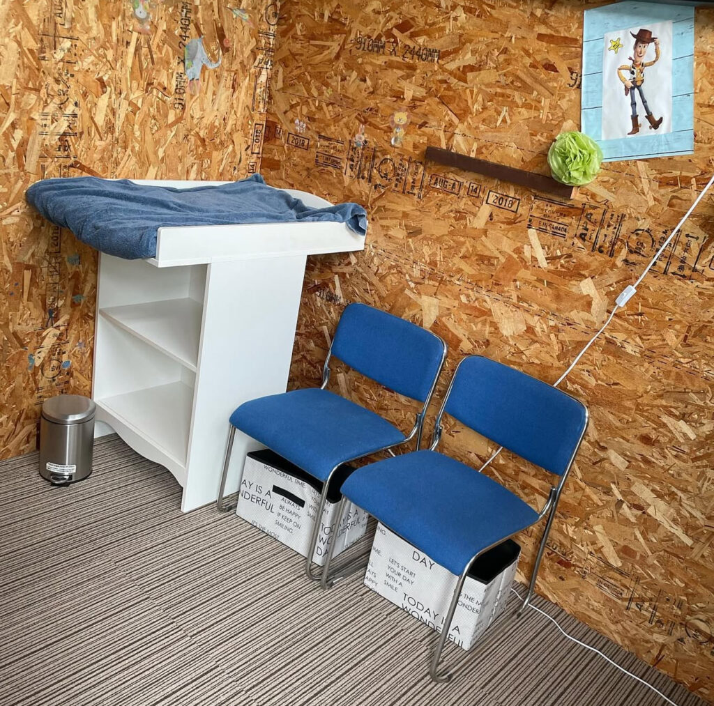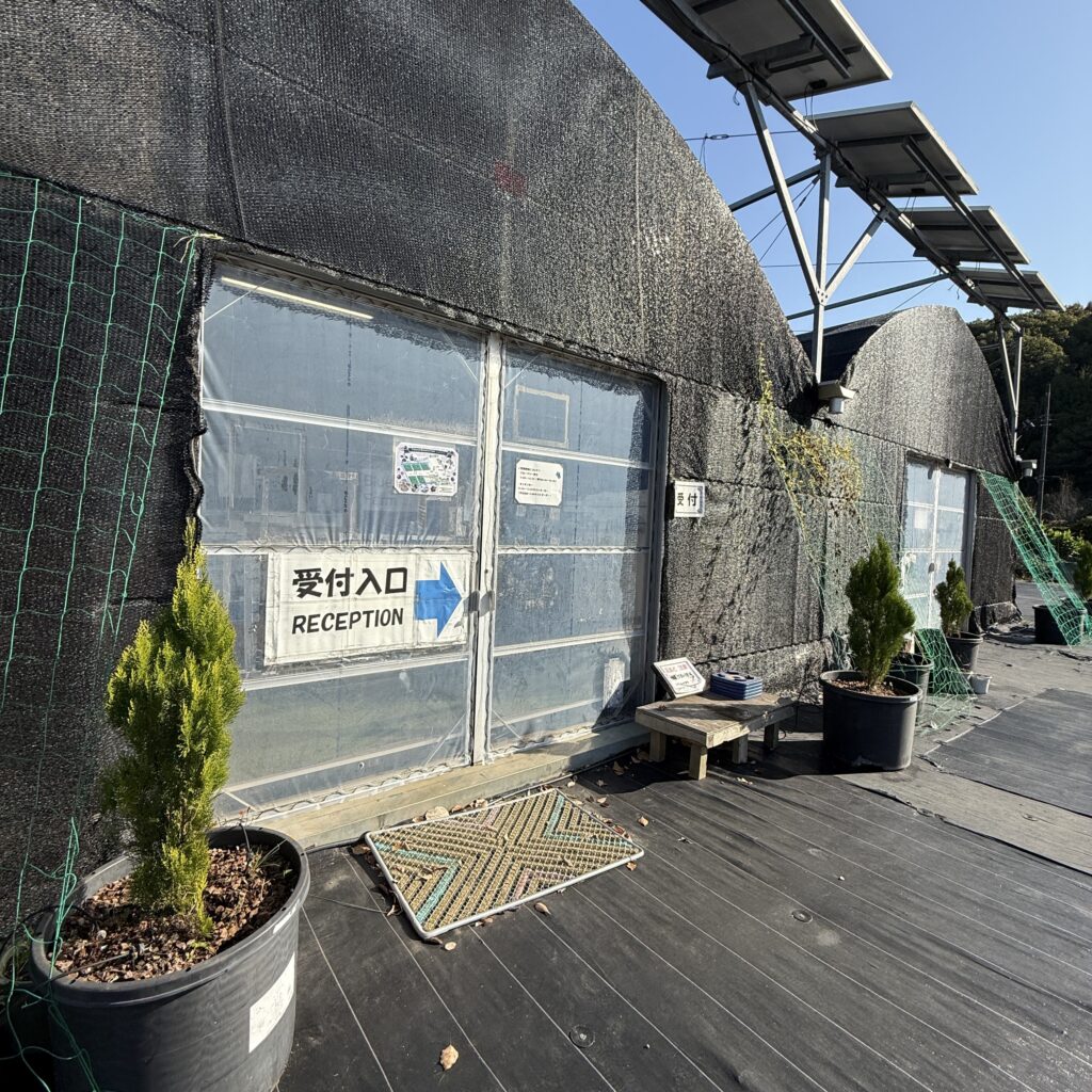 農園入口手前にあるハウスの中で受付を行っております。同じスペースにテーブルとイスをご用意しております。ロッカーや更衣室兼授乳室を完備した半個室をご用意しております。休憩エリアとカーテンで仕切っております。受付横にはお土産もございます。