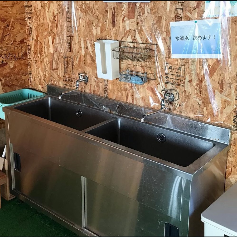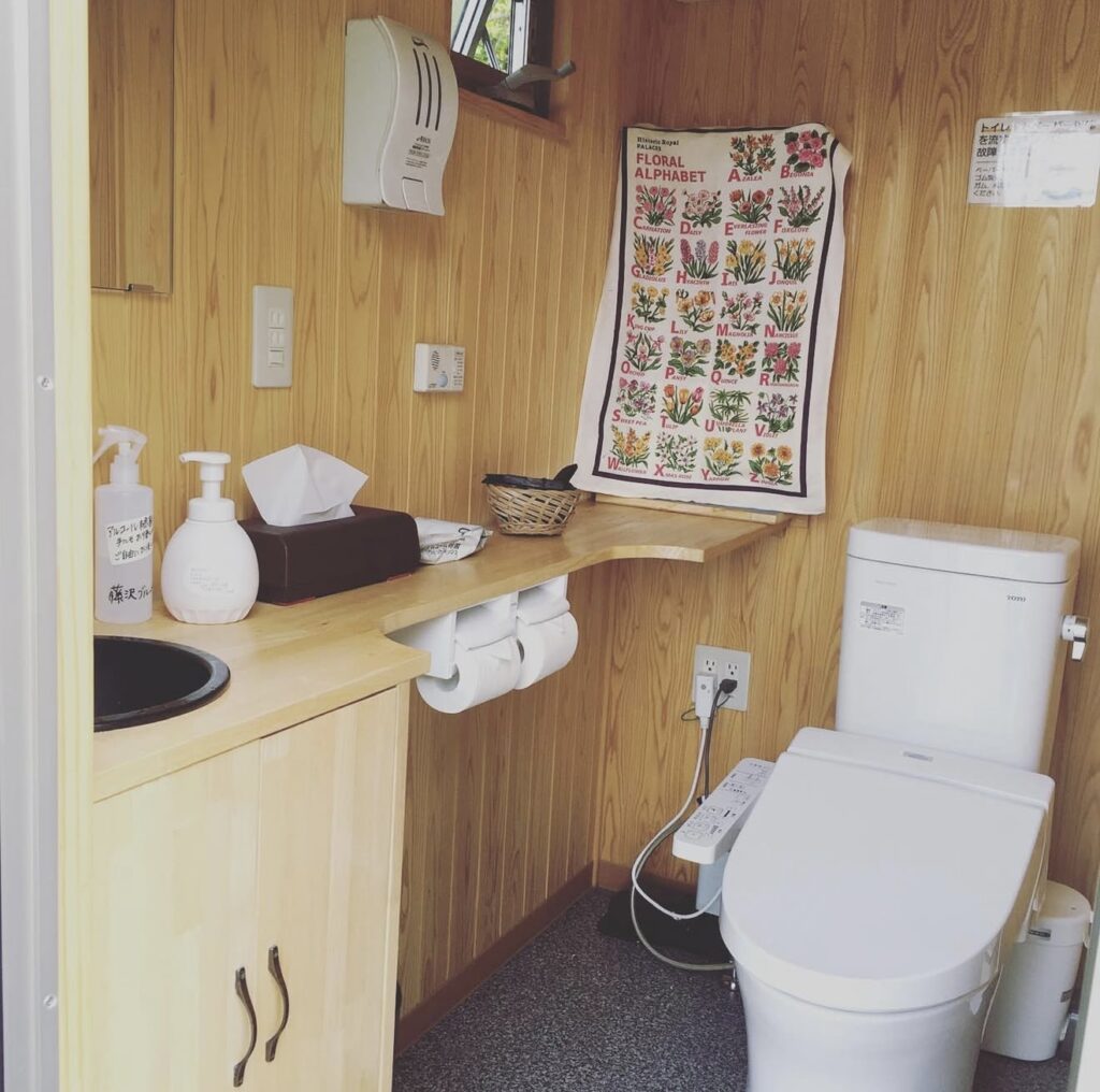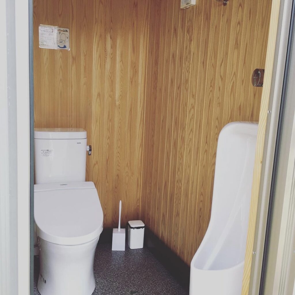 簡易設置トイレなのでドア前は段差があります。一つは男性用も設置しております。水洗ですが汲み取り式になっています。トイレットペーパー以外は流さないようご注意くださいませ。