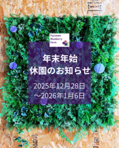 いつも藤沢ブルーベリーファームをご利用いただき誠にありがとうございます。 誠に勝手ながら下記の期間休業とさせていただきます。 12月28日(土)ー1月7日(火) ご迷惑をおかけしますが、何卒ご理解くださいますようよろしく […]